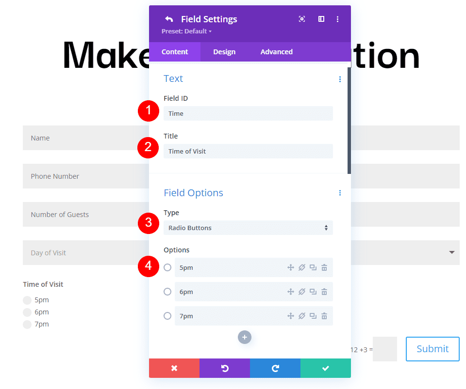 First, edit the Title Text to show “Make a Reservation.” Highlight the portion of text you don’t want and click the Delete key.