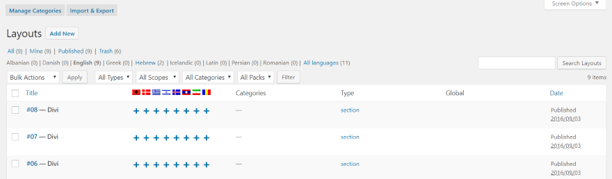 The Divi Library lets you translate layouts like the pages and posts. Translate individual modules, rows, sections, and complete layouts. Flags are added to the list. The layouts include + symbols that you can click on for the translation you want. Clicking a + symbol opens the Advanced Translation Editor.