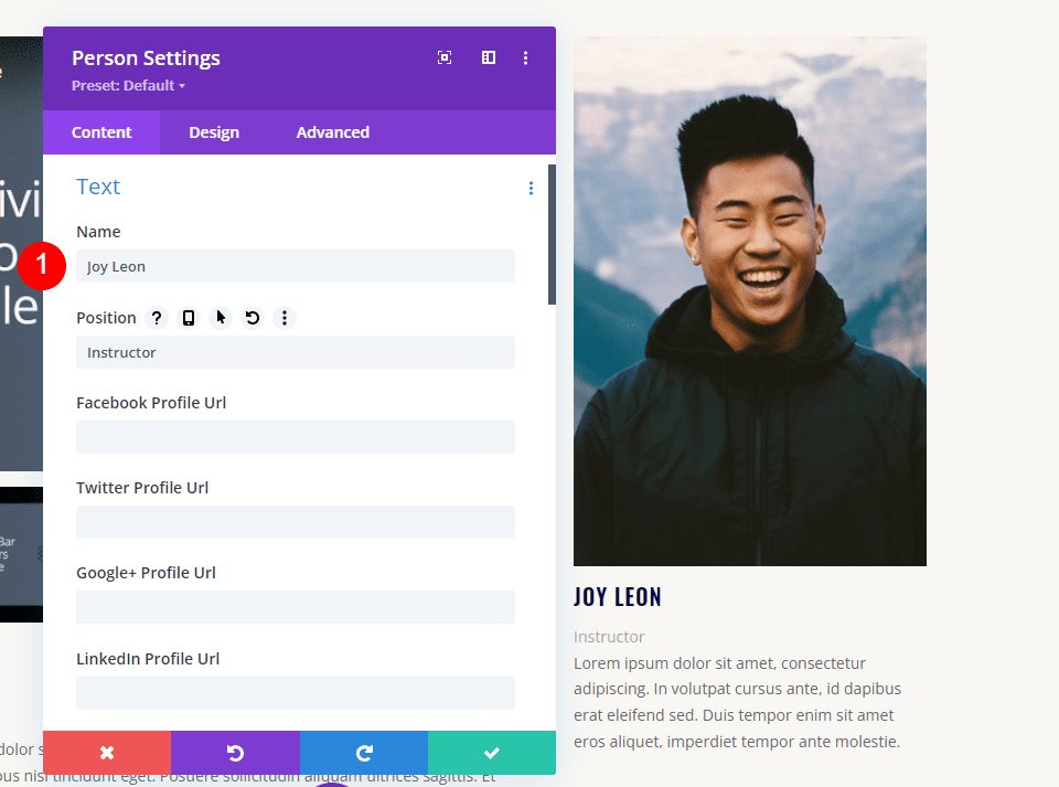 In the General tab, under Text, enter the person’s name into the Name field and type Instructor in the Position field. Enter any of the social media links you want. I’m leaving them blank for this tutorial.
