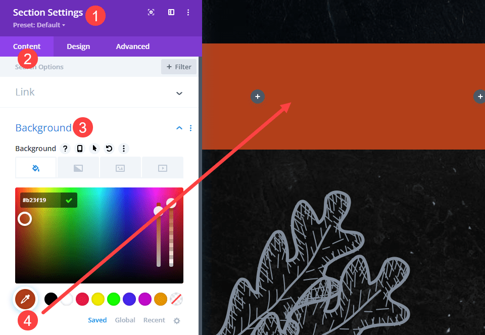 First, go into the Section settings and navigate to Background under the Content tab. We are using the color #B23F19 as a background.