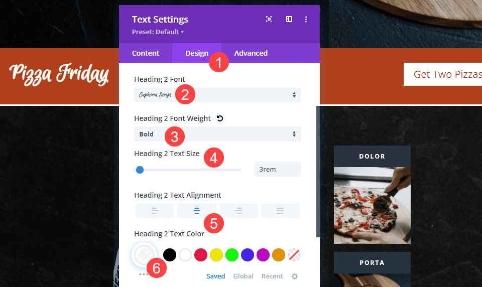 Then go into the Design tab. For this particular design, we chose Eudora Script as the heading font, Bold font weight, 3rem as the text size, and white text color with center alignment.