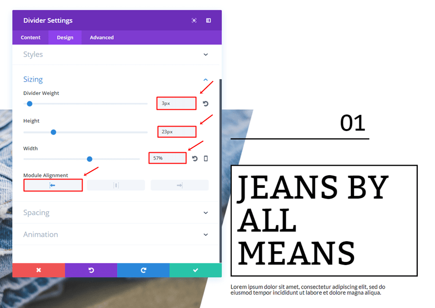 Then, open the Divider Module and change the Module Alignment within the Sizing subcategory to right.