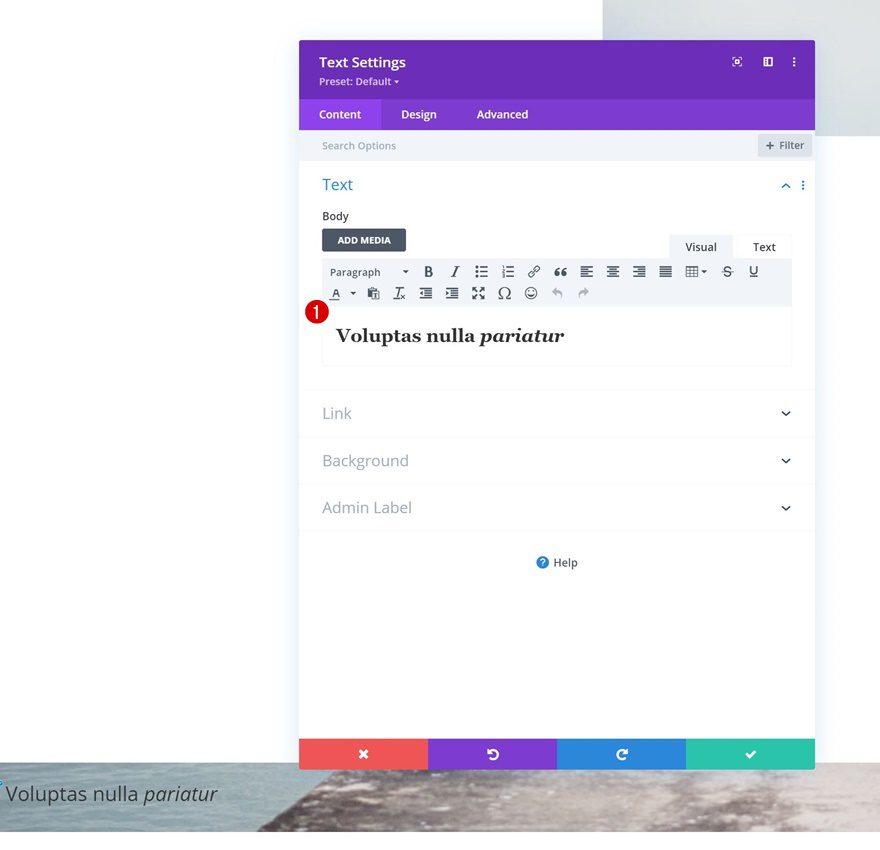 Once you’ve completed the row settings, add a Text Module to its column. Leave the content box empty. We’re, instead, using this module to create a shape that reveals a part of the section background image.