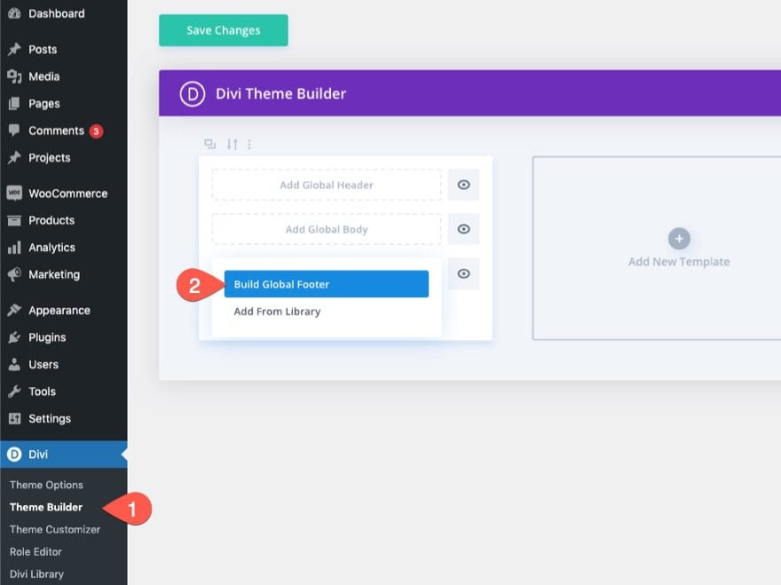 Start by going to the Divi Theme Builder in the backend of your WordPress website. There, add a new global or custom footer.