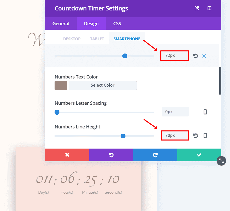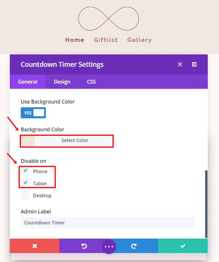 Add a Countdown Module below the Text Module you just created. In the General Settings tab, add the date and time of the wedding and change the background color to ‘#fae4de’. We’ll use this countdown on desktops only, go ahead and disable it for tablets and phones.