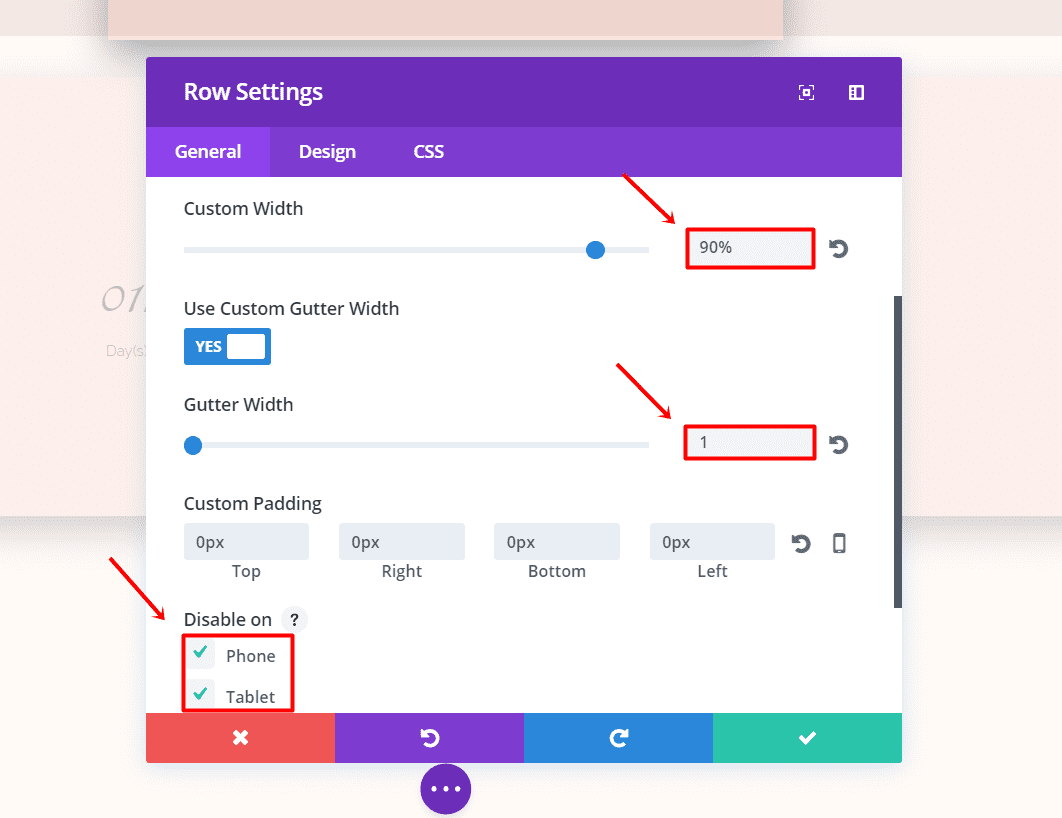 Next, open the row settings. In the General Settings, select ‘YES’ to use custom width, change the unit to percentage and fill in ‘90%’. Scroll down in the same tab, activate Gutter Width and hide for phone & tablet.