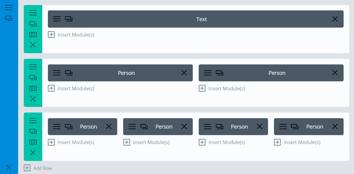 Add another row, in this case with two columns and add 5% to the top and bottom margin. Next, add a person module in the first column of the row.