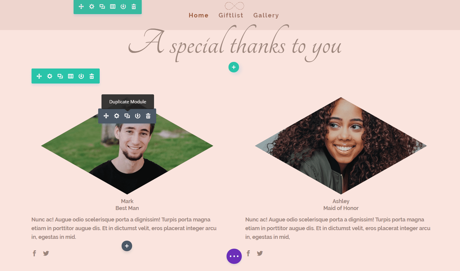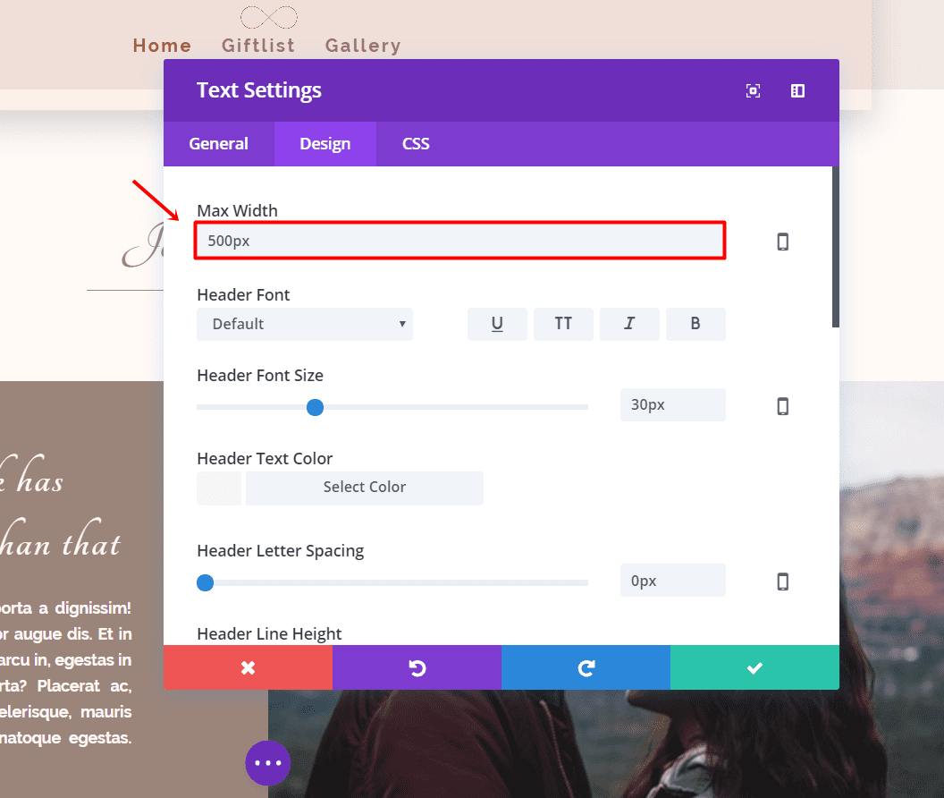 Now, under the Countdown Module, add another Text Module. In the General Settings tab, change the Text Orientation to ‘Center’. Continue by adding the groom and bride’s name and going to the Advanced Design Settings tab.