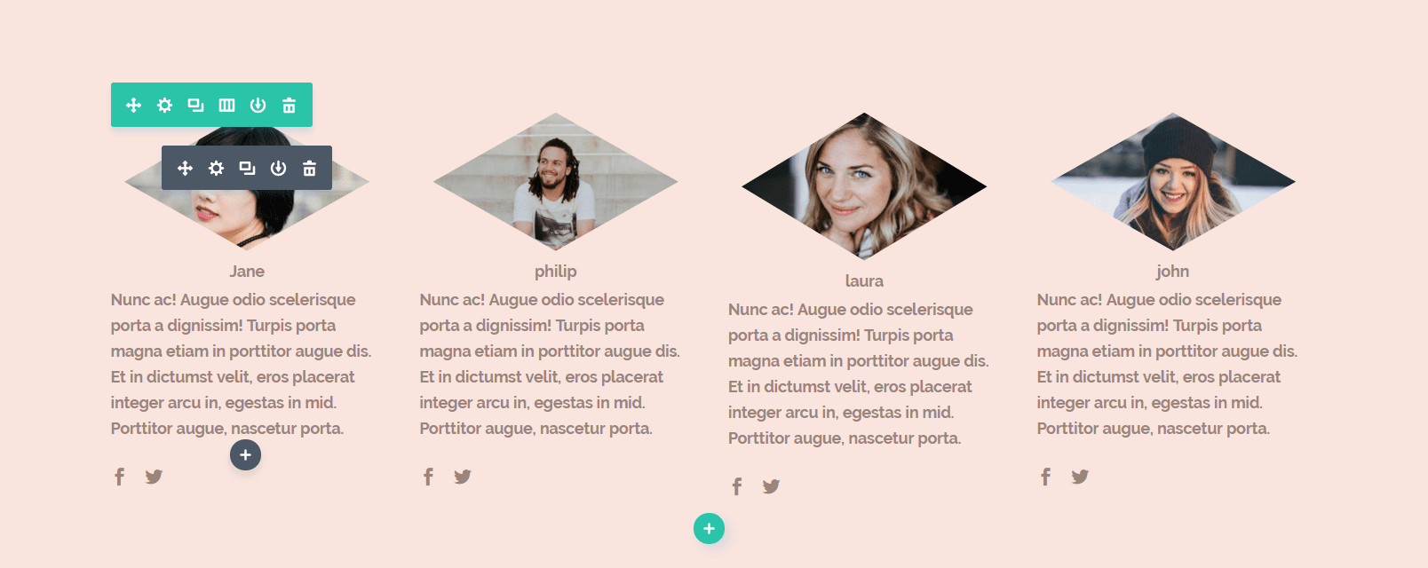 Continue by adding a new row with four columns and clone the Image and Person module again (four times) and put them in each column. The code and settings we used the first time will apply to all of them.