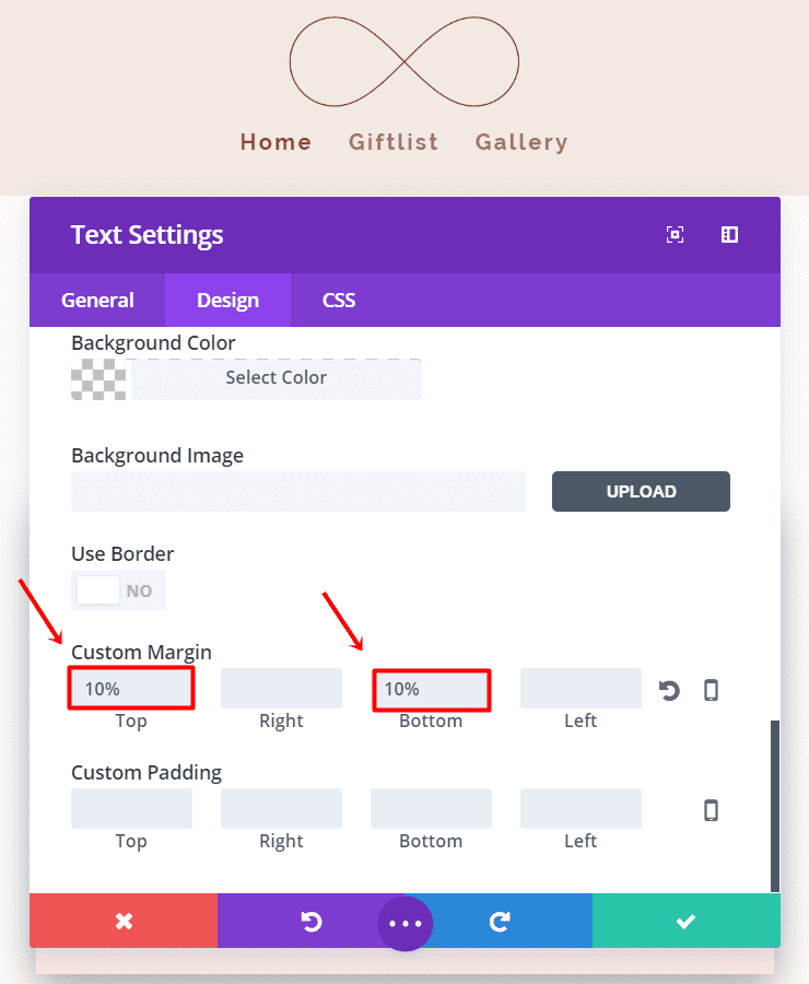 Continue scrolling in the Advanced Design Settings tab to Custom Margin and add ‘10%’ to the top margin.