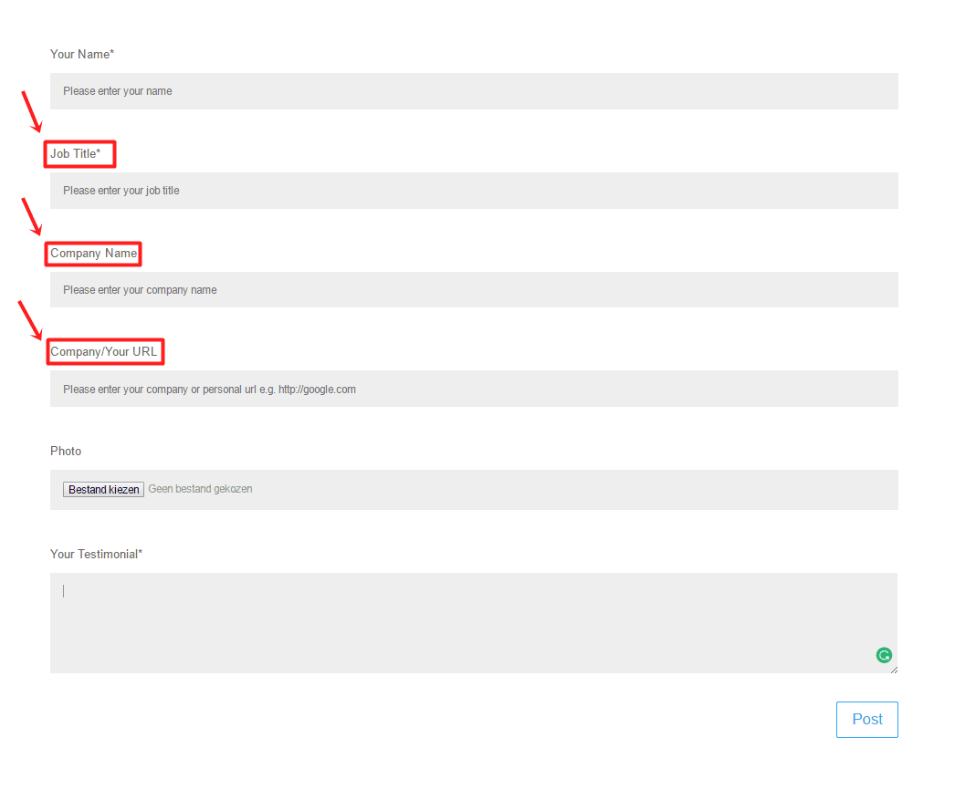 When you manually try to add a testimonial to your WordPress site, you’ll still see the titles ‘Job title’ and ‘Company name’. However, these never show up on your website, so feel free to type down an answer to the new questions we made.