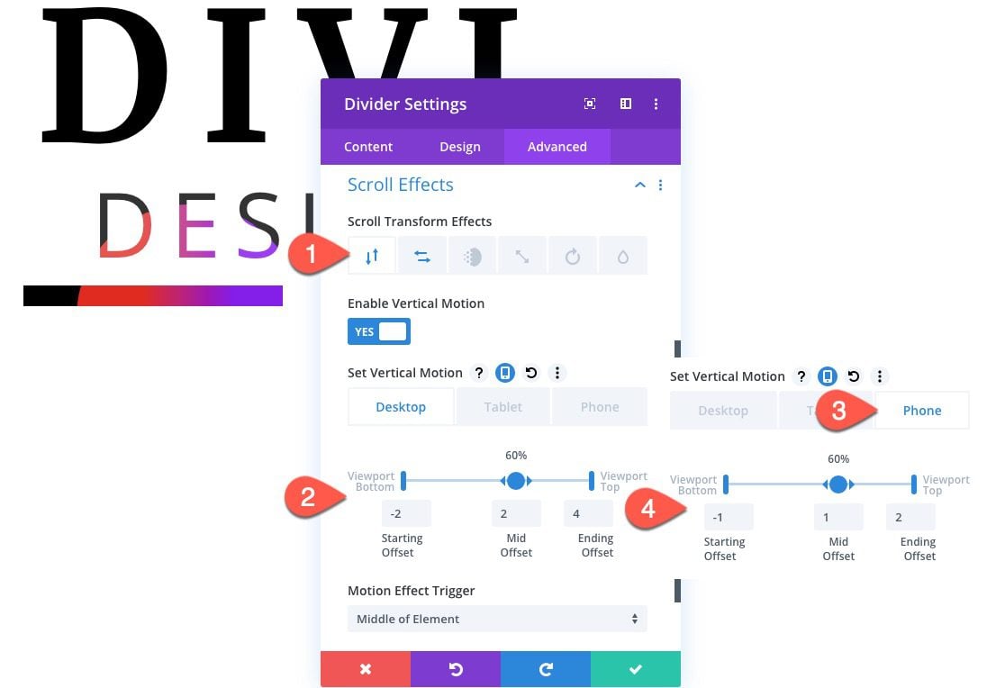 With the divider in position, all we have to do is move the divider behind the text using Divi’s scroll effects. For this design, we are simply going to add a horizontal motion on scroll.
