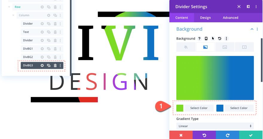 Then open the settings for the top divider in the new/third section and add the black color back to the gradient background as follows: