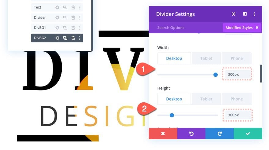 We want to set the height of the divider to be hight enough to color all of our text in the text module and the top and bottom dividers. For this design, set the height to 400px.