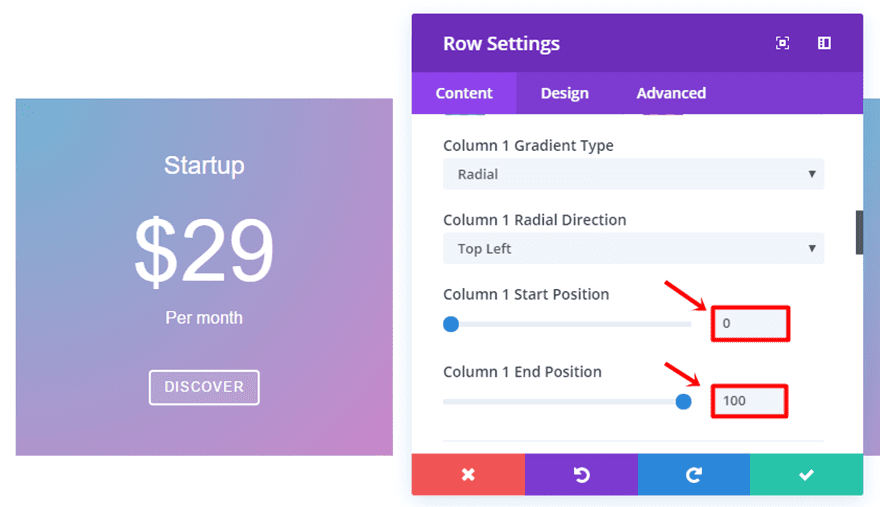 Go to the row settings and apply the following changes to the gradient option of the first and third column within the Background subcategory of the Content tab: