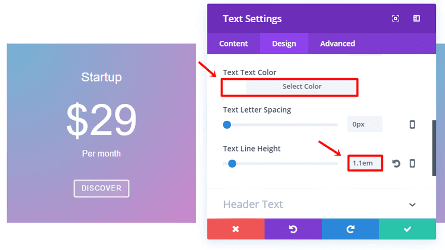 Add another Text Module to the same column. Write down the price of the package in the content box within the Text subcategory of the Content tab and move on to the Design tab.