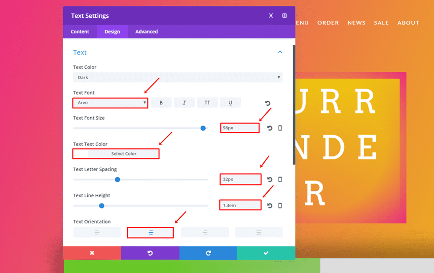 Once you’re done with the row settings, add a Text Module and use the following settings for the Text subcategory: