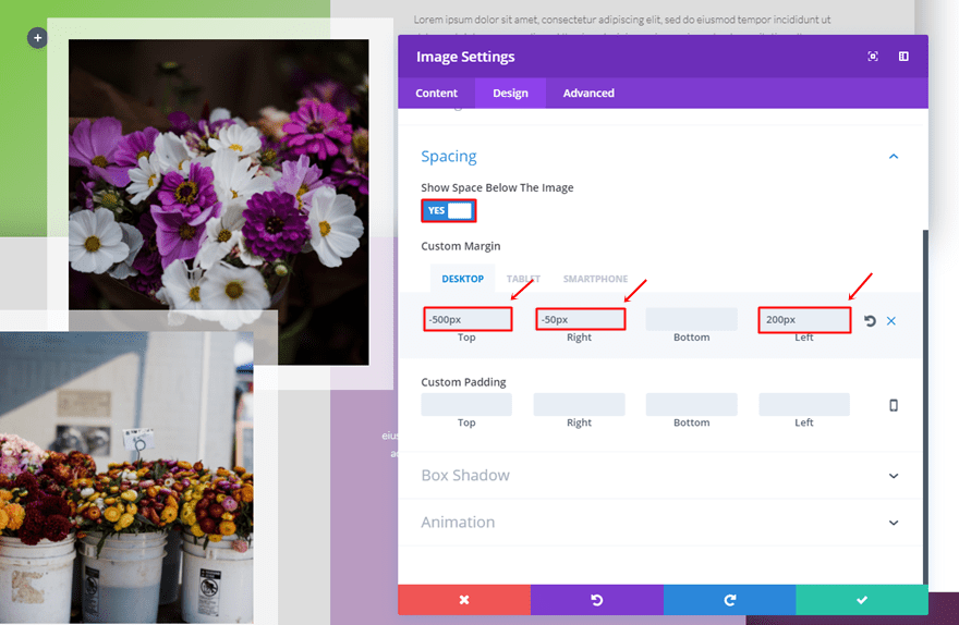 Move on to the Design tab. Within the Spacing subcategory, use ‘100px’ for the top padding and ‘200px’ for the bottom padding.