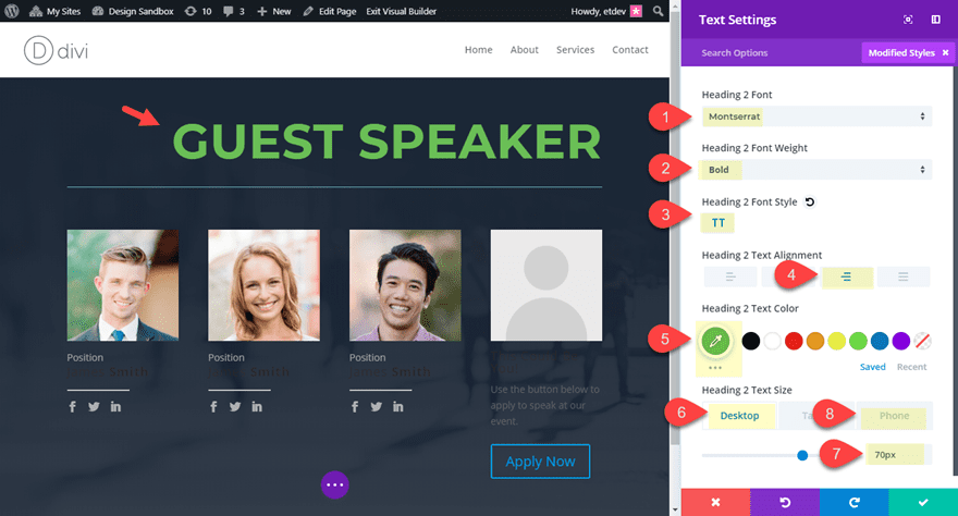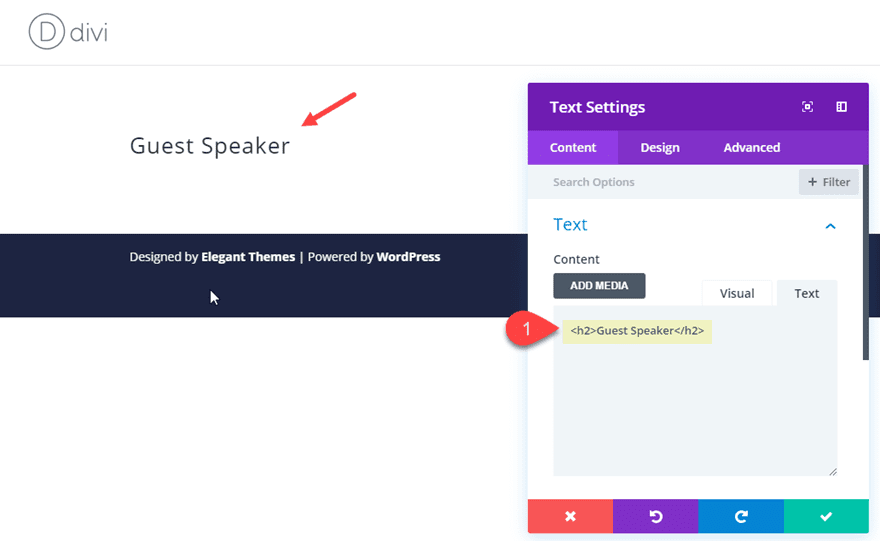 Open the settings of the text module containing your section headline “Guest Speakers” and update the following: