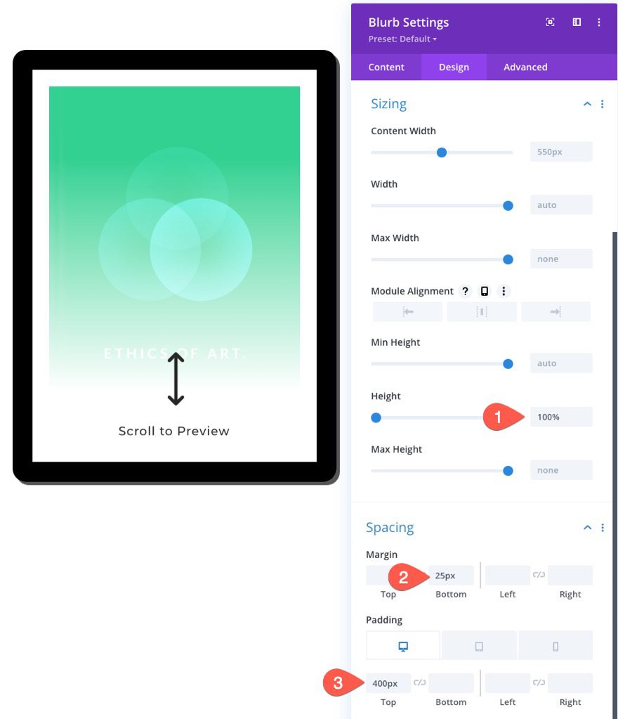 We can adjust the height of the blurb to match the column height so that it fills the tablet using 100% height. This height percentage value only works because our column has a set height. Then we can move the icon and title to the bottom of the column by adding top padding.