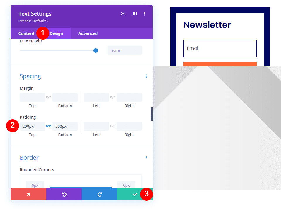 Select the Design tab and scroll to Spacing. Add 200px for the Top and Bottom Padding. Close the moduleβs settings.