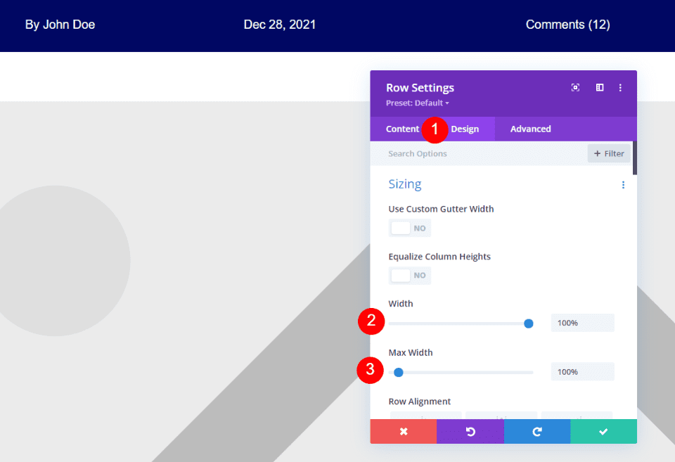 Open the Row settings and add 100% for the Width and Max Width under Sizing. Close the Row settings.