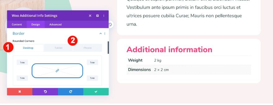 Below the description module, add the woo additional info module. Choose this product in the content tab.