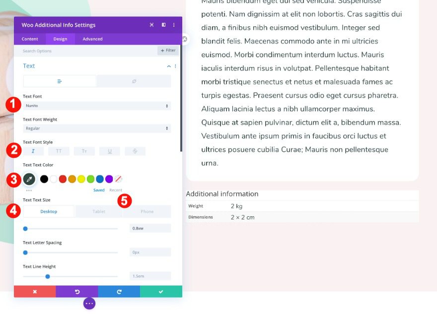 In the design tab, start styling the different text types. First, the text that applies to the values of the attributes.