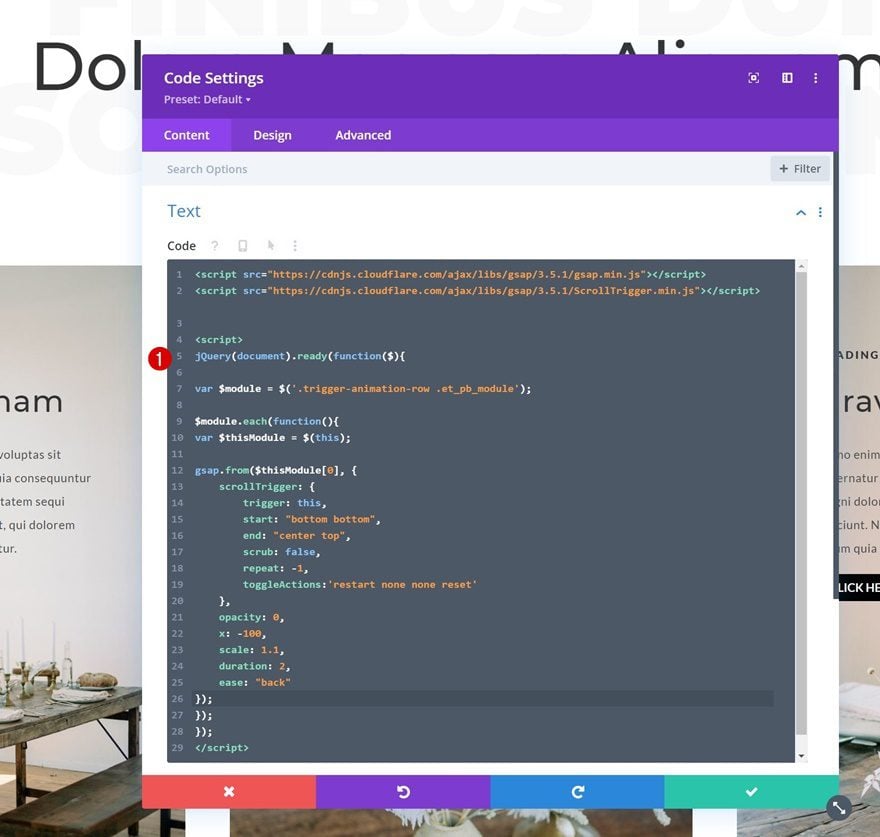 The CSS class weโve added in the previous step of this tutorial will help us target all modules inside this row at once. To create the restart animation, weโre using some JQuery code, the GSAP JavaScript library and the ScrollTrigger library for GSAP. To add this code, weโll insert a new Code Module below the second Text Module in row #1.
