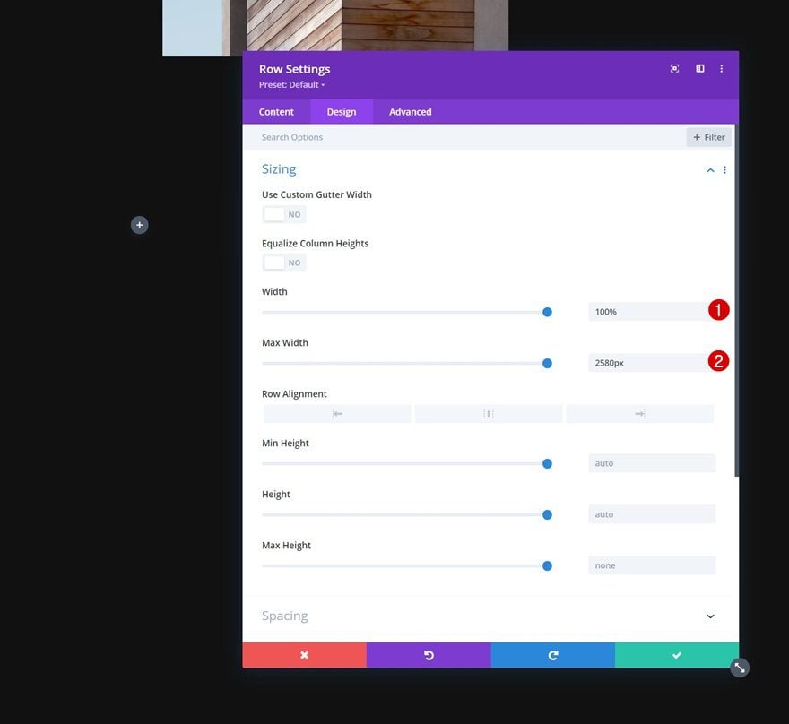 Without adding modules yet, open the row settings, go to the design tab and change the sizing settings as follows: