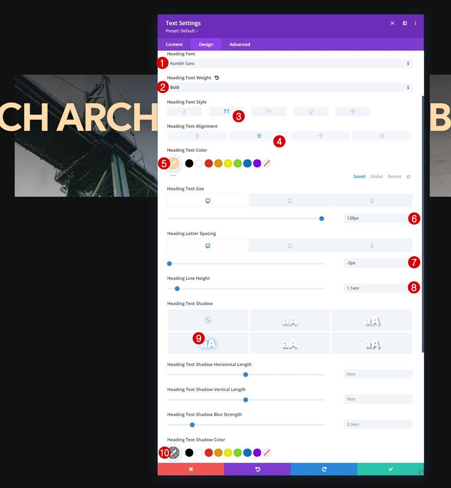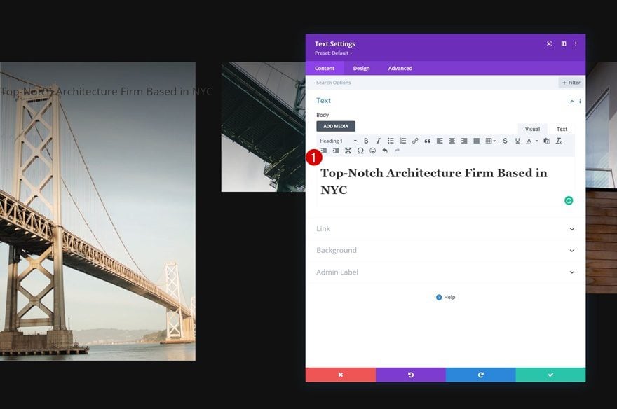 Move on to the moduleโs design tab and change the H1 text settings accordingly: