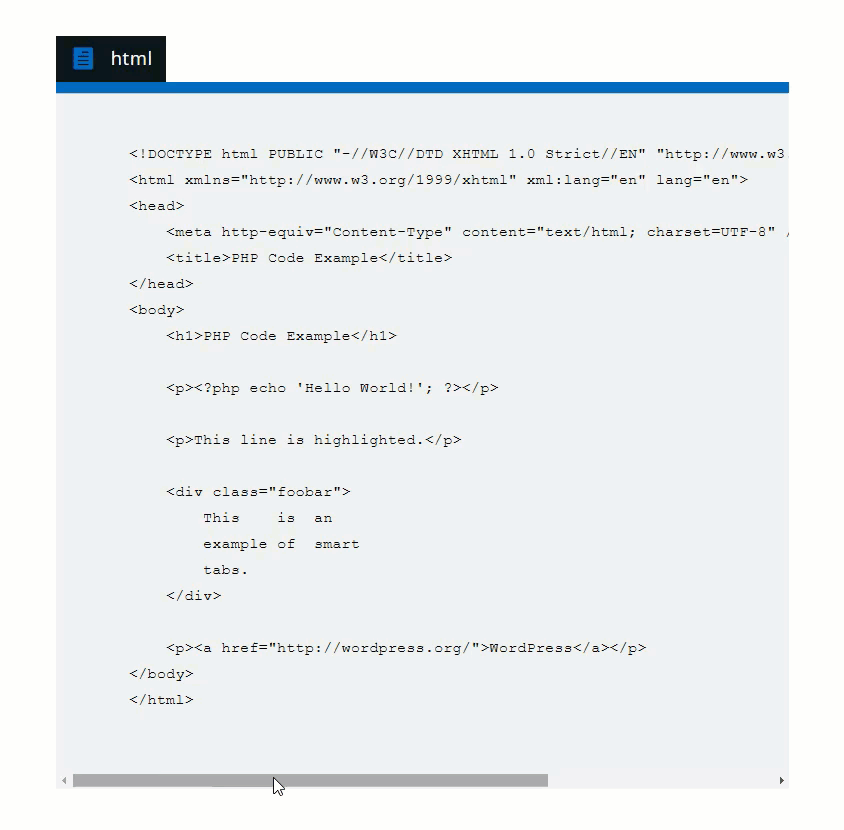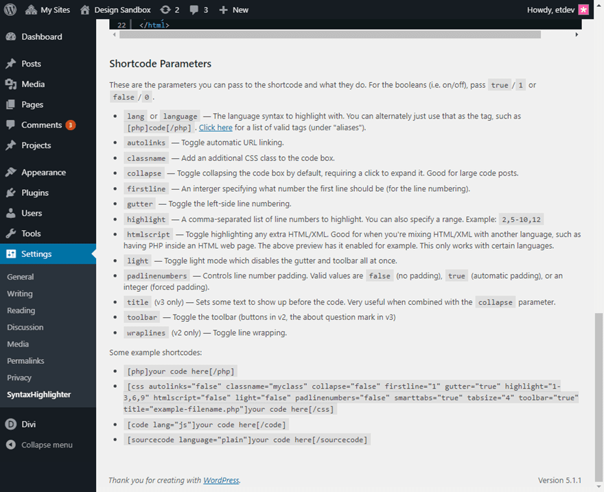 Note: You will probably want to explore the different shortcode parameters available. They will allow you to highlight certain lines of code among other things.