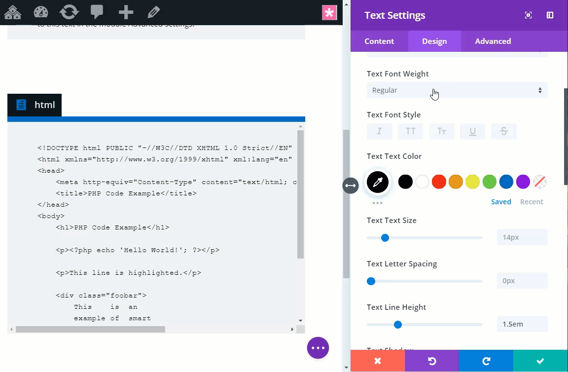 You can leave the default content in there for now. We will be adding our WordPress code snippets there later. For now, let’s style the text module by updating the following text settings: