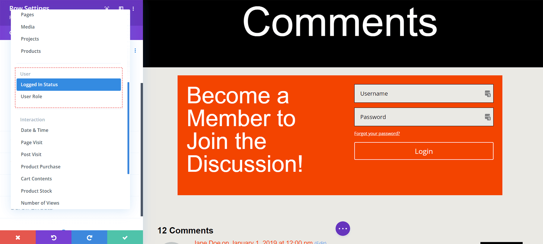 Using Divi’s Condition Options, we can now show a Login Module. Once a user has logged in, they can interact with the Comment Module. If they are not a logged-in user, they cannot see or submit a comment.