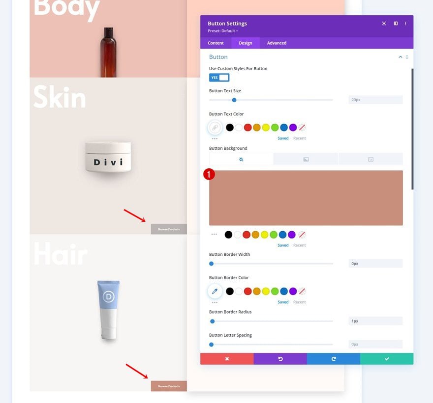 Move on to the moduleβs design tab and style the button accordingly: