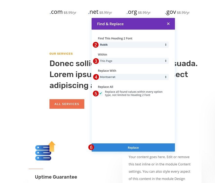 Time to start making some manual changes! The first thing we’ll do is match the font. Open a Text Module on the page and find the Rubik font that is used throughout the page. Then, click on Find & Replace and replace the font with Montserrat.