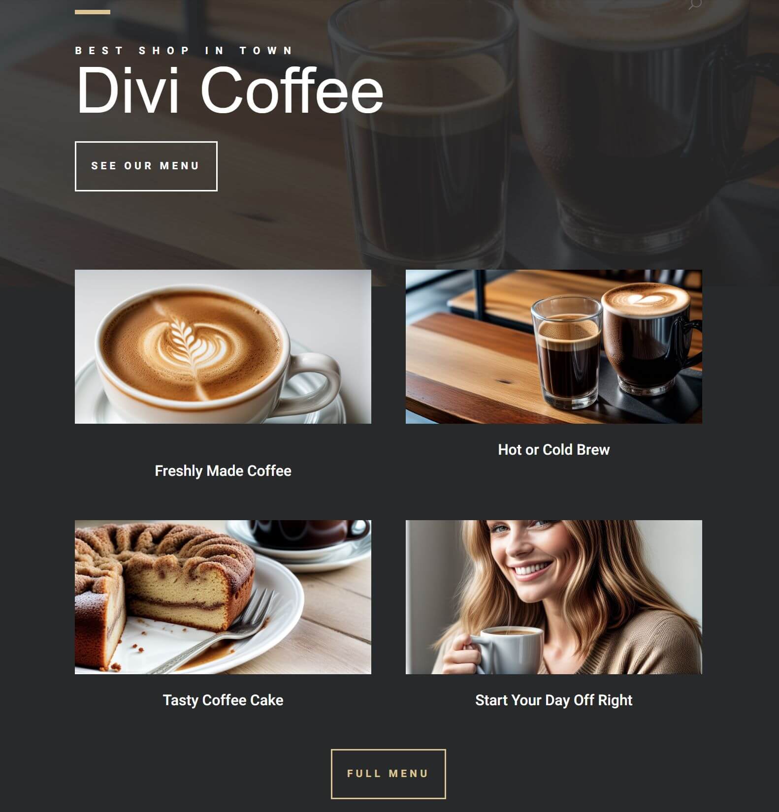 Let’s say we wanted to use this layout to create a website for a coffee shop. We could replace these pretzel images with coffee-related images that have a similar style and color.