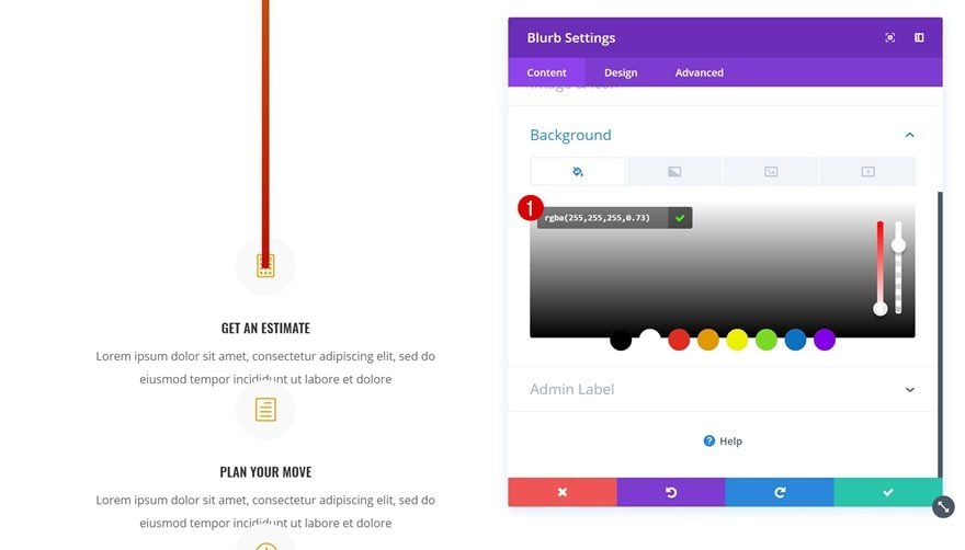 We’re going to use one of Divi’s efficiency features to speed up the process while editing our Blurb Modules. We’ll apply all changes to the first Blurb Module and afterwards, we’ll simply copy the module styles and add them to the other Blurb Modules in one click. Open your first Blurb Module and add ‘rgba(255,255,255,0.73)’ as the background color.