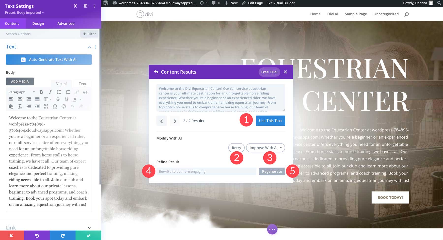 Furthermore, you can add a text prompt to refine your results (4). Once all of your chosen settings are in place, click the regenerate button (5) to refine your text.
