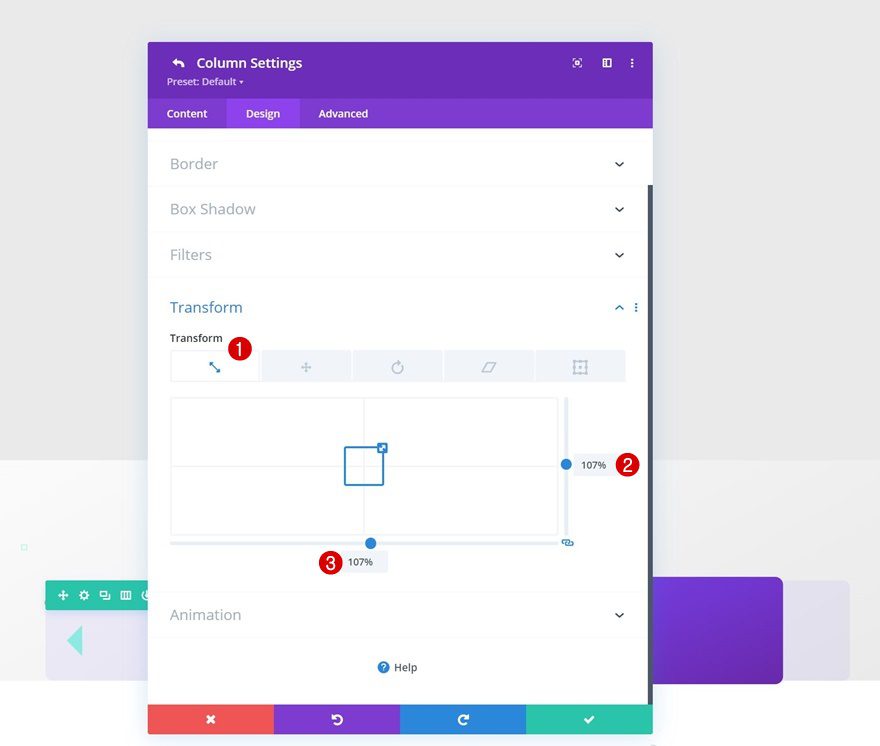 And we’ll increase the column’s size in the transform settings by applying the following transform scale values:
