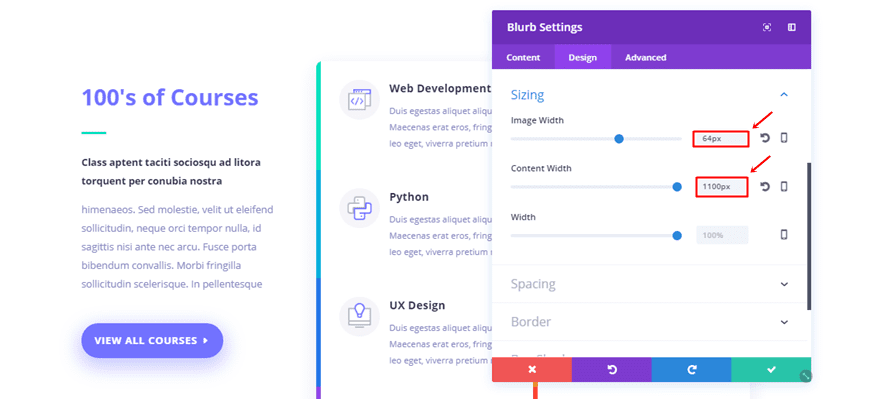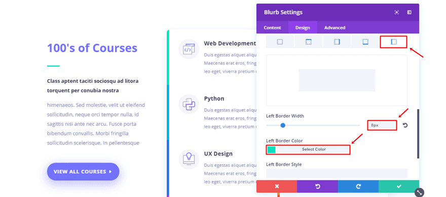 Once youโve completed the Blurb Module, you can clone it as many times as you want and place it within both the columns. The only thing left to do is change the content and left border color to make each Blurb Module unique.