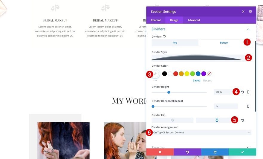 Of course, we want these section transitions to look equally as good on smaller screen sizes. That’s why we’re going to hide some of the modules we’ve used. Start by opening the settings of the Divider Module in column 3.