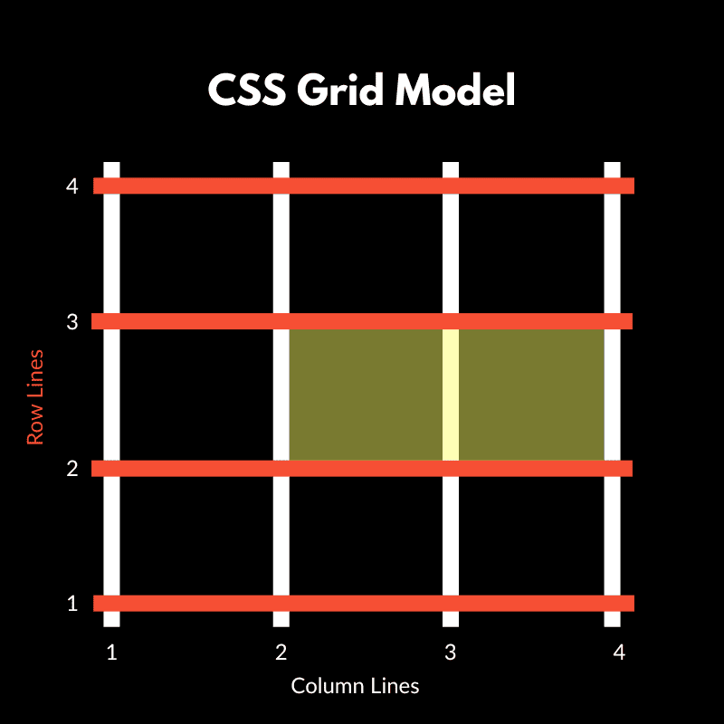 Look at the grid above. The white vertical lines are numbered 1 through 4 at the bottom. Those are column lines. The orange horizontal lines, numbered 1 through 4 on the left, are row lines. The spaces between are the gaps where your content lives.