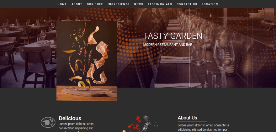 Modern Restaurant and Bar is a one-page layout for cafés and restaurants. It displays a full-width image with header and tagline text and an image that overlaps the next section. Following this is a three-column section with information within bullets with large restaurant icons, an image, and a column with About Us information. Information about the chef is displayed over a background image. A section highlighting the ingredients displays a full-width image (a great replacement for a recipe plugin). Also included styled blurbs, a full-width blog showing the latest post, styled testimonials, and a contact form. The design makes excellent use of images, fonts, and color.