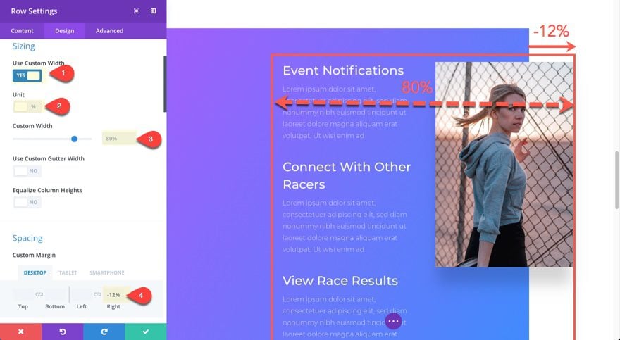 To offset the row, you simply add a -12% right margin to pull the row to the right of the section. Notice how the text is aligned in the center of the purple section and the image is overlapping halfway into the exposed white content area. This is a great way to offset your content in a way that creates a unique layout and looks pleasing to the eye.