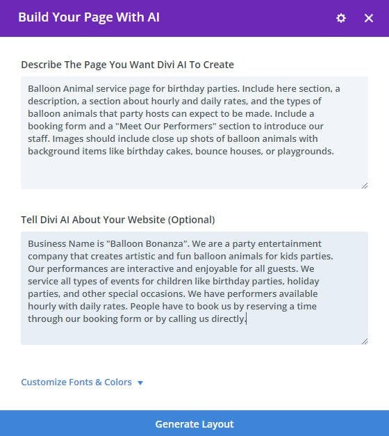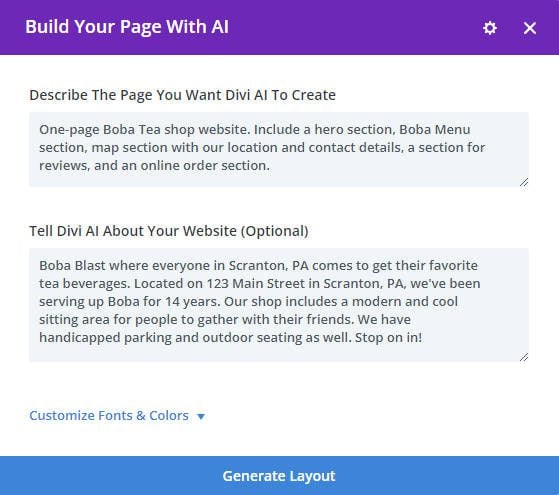 Divi Layouts AI takes multiple inputs before creating a new page or theme builder template. There are two main inputs and text fields for adding your request: