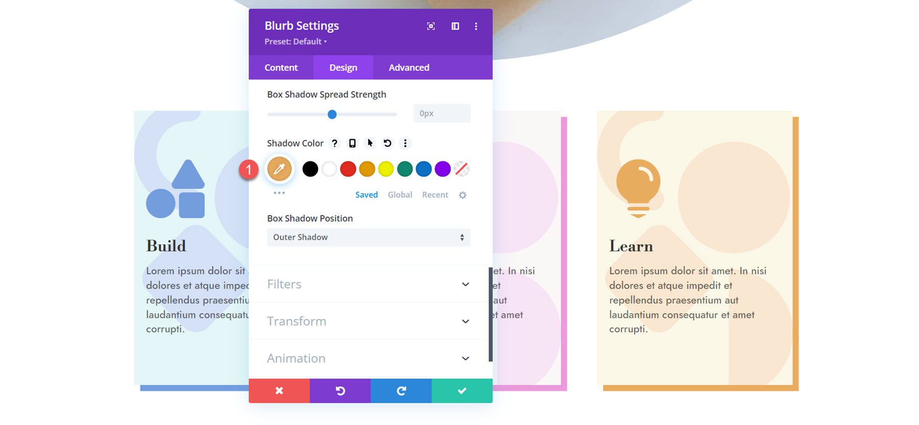 Here, you can set a box shadow for the entire blurb. With the box shadow enabled, you can set the positioning, blur and spread strength, shadow color, and shadow position.