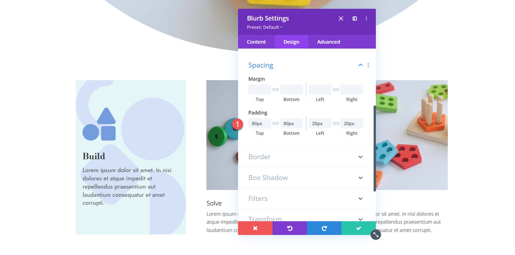 Next, the spacing section is where you can set the margin and padding for the Blurb Module.
