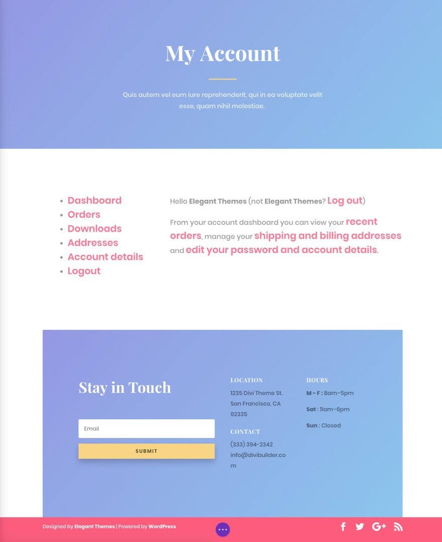 Now that you know how to add a header to these WooCommerce pages, go ahead and do the same for the My Account page. This time you can add the footer section you saved to the library to the bottom of this page.