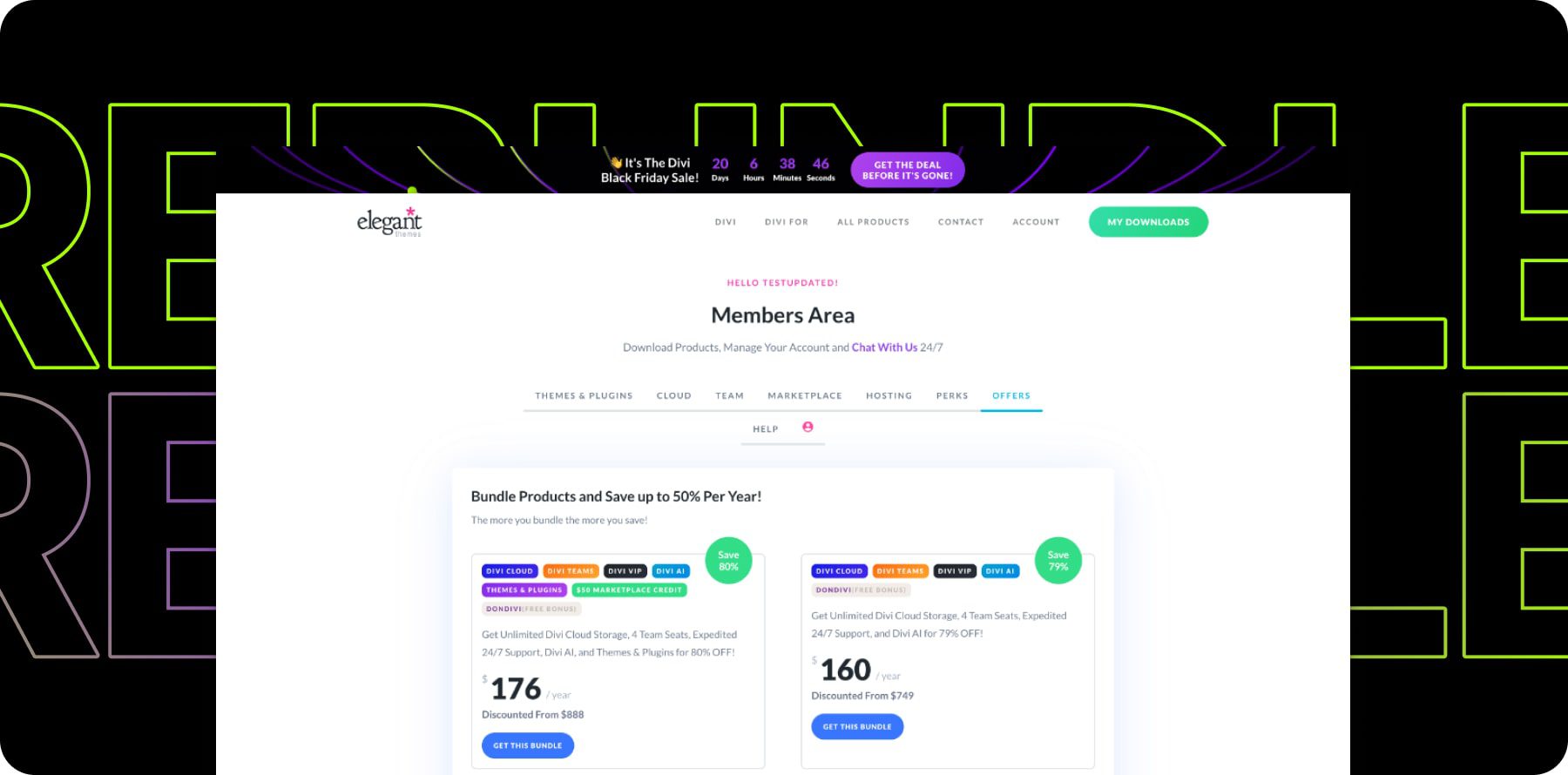 - π Repackage Your Membership for Up to 80% Off β Existing members can repackage their existing subscriptions into a Black Friday bundle to reduce subscription costs and unlock more features. Unlock Divi AI, Cloud, Teams, VIP Support, DonDivi, and a free $50 marketplace while reducing your existing subscription cost by up to 80%.